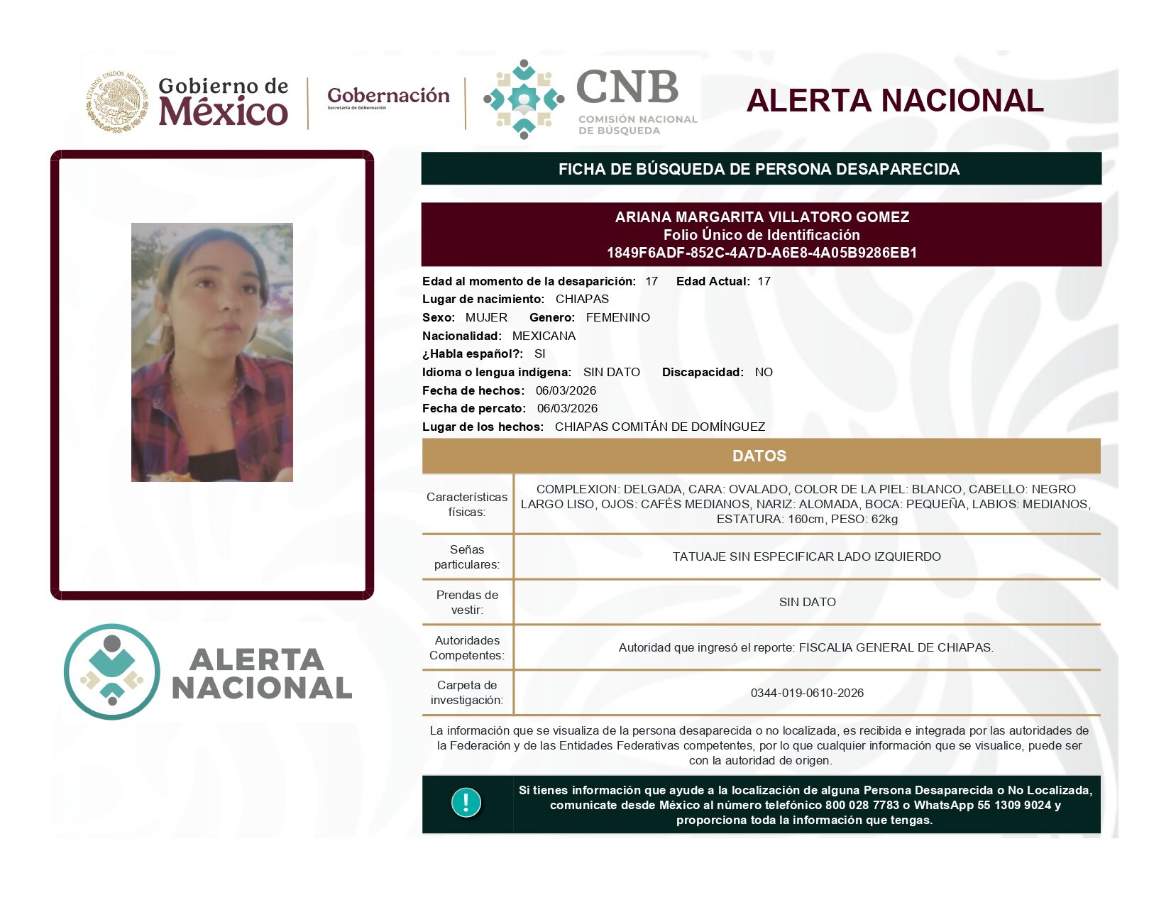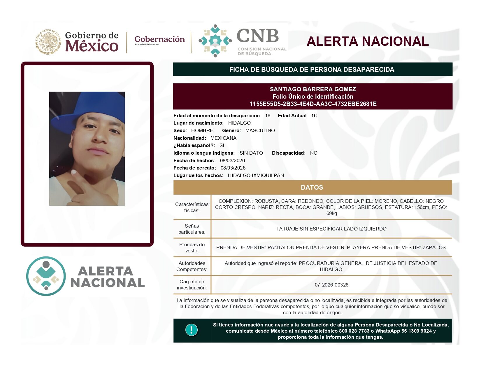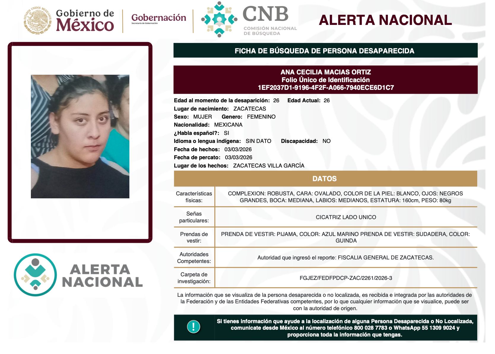 Se activa la Alerta Nacional de Búsqueda, Localización e Identificación de Personas Desaparecidas y No Localizadas de la Persona.